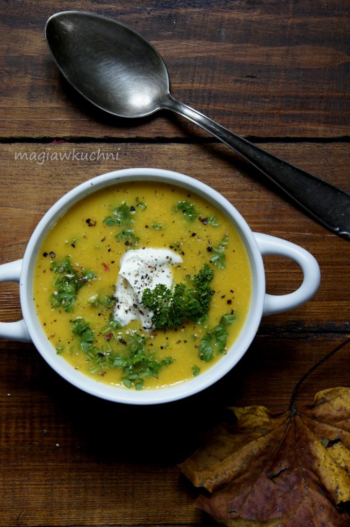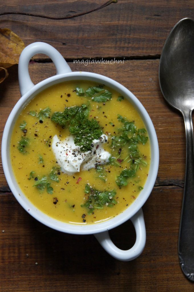 Do garnka przełożyć dynię pokrojoną w kostkę , łodygę selera pokroić na mniejsze kawałki wrzucić do garnka wraz z obranymi migdałami. Białą część pora podsmażyć na odrobinie tłuszczu i przełożyć do garnuszka – zalać wszystko wodą w której moczyły się migdały, dodać przyprawy oraz połowę mleka migdałowego . Gdy dynia będzie już miękka dodać resztę mleka i całość zmiksować na gładko, spróbować i ewentualnie doprawić do smaku solą i pieprzem. Przed podaniem wymieszać z posiekana kolendrą ewentualnie pietruszką, podawać z kleksem śmietany kokosowej.