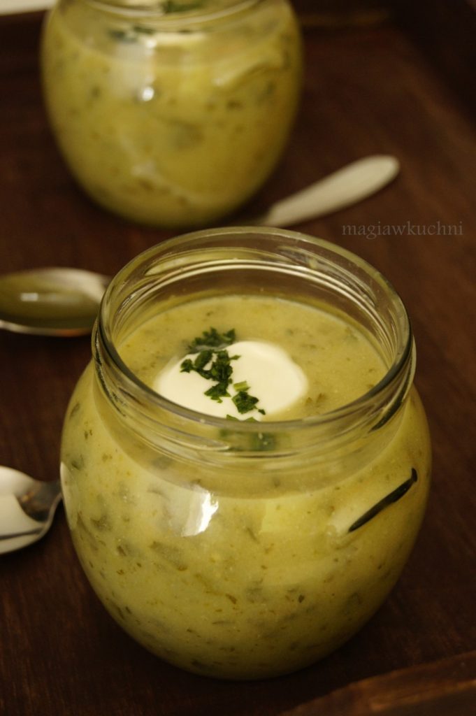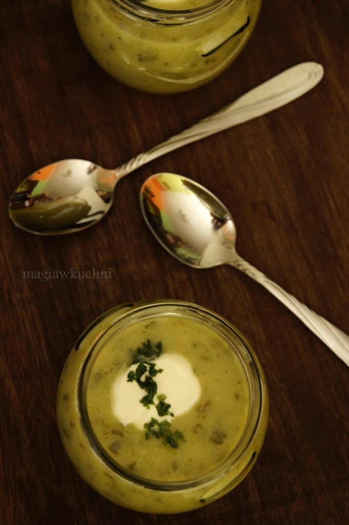Do ugotowanego bulionu wrzucamy obrane i pokrojone w kostkę ziemniaki, cukinię oczyszczoną z miękkiego miąższu jeżeli taki posiada oraz kalarepkę obraną ze skóry i pokrojoną w kostkę. Całość doprawić solą i pieprzem oraz ziołami i czosnkiem -gotować do miękkości. Na końcu wymieszać z posiekaną natką i jogurtem lub śmietaną – wszystko zmiksować. Można podawać na zimno lub ciepło z kleksem jogurtu greckiego.