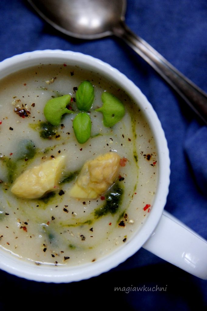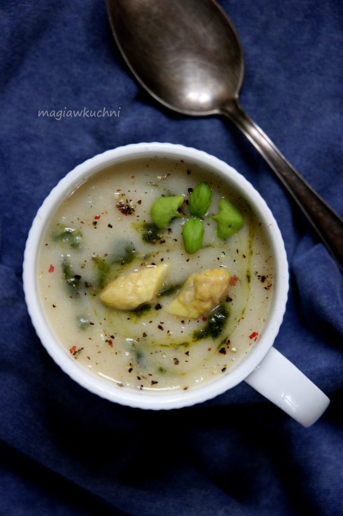 Cebulki oczyścić i pokroić w kostkę , zeszklić na oleju kokosowym i przełożyć do garnuszka. Dodać oczyszczonego ziemniaka pokrojonego na mniejsze kawałki. Szparagom odciąć końcówki i obrać jak najcieniej od połowy, pokroić na mniejsze kawałki i wrzucić do garnuszka – całość zalać cydrem wraz z bulionem. Gotować na małym ogniu ok 20 minut ( aż ziemniaki będą miękkie) – zmiksować blenderem na gładko.